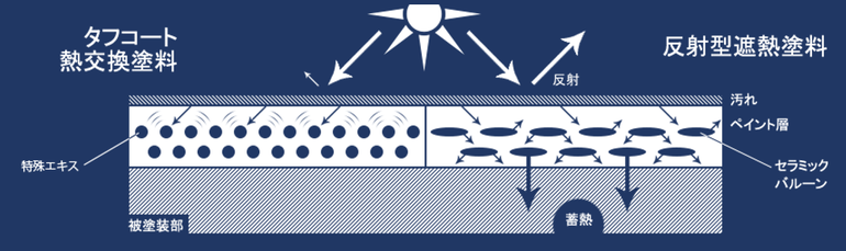 寒冷時は外部からの熱を自然に取り込みますが、反対に気温が25度を超えたあたりから「塗膜内」で熱の交換が活発になり蓄熱を抑えます。